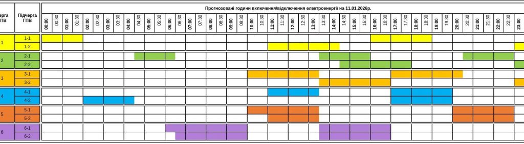 На неділю, 11.01.2026, оприлюднено графік погодинних включень та відключень електроенергії для побутових і непобутових споживачів.