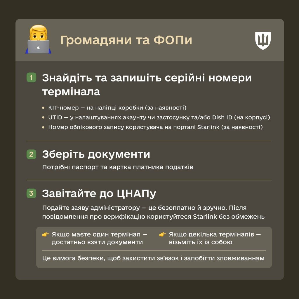 Цивільні та ФОП: Необхідно звернутися до найближчого ЦНАПу з паспортом та РНОКПП. Якщо у вас більше одного термінала — їх потрібно взяти з собою для фізичної верифікації. Послуга безоплатна.