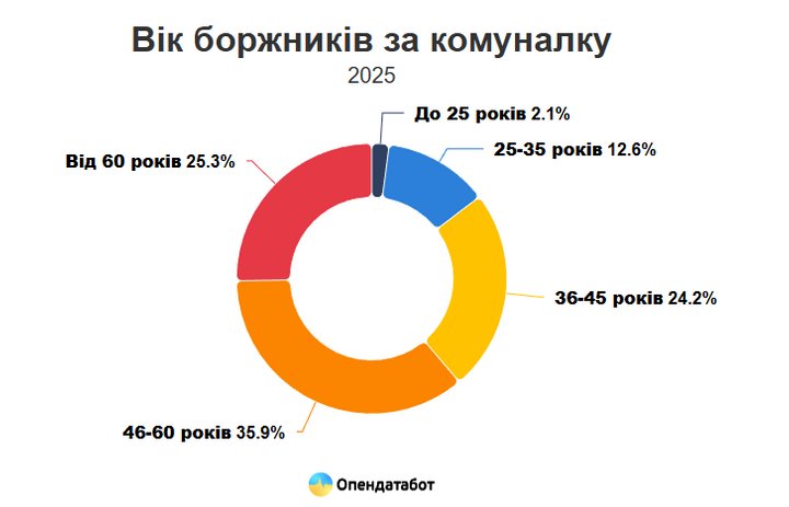 Найбільшу кількість проваджень (майже 36%) відкрито проти громадян віком 46–60 років. При цьому, кожен четвертий борг припадає на пенсіонерів. Загальна кількість виконавчих проваджень у Єдиному реєстрі боржників за комунальні послуги перевищує 794 тисячі.