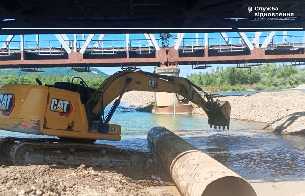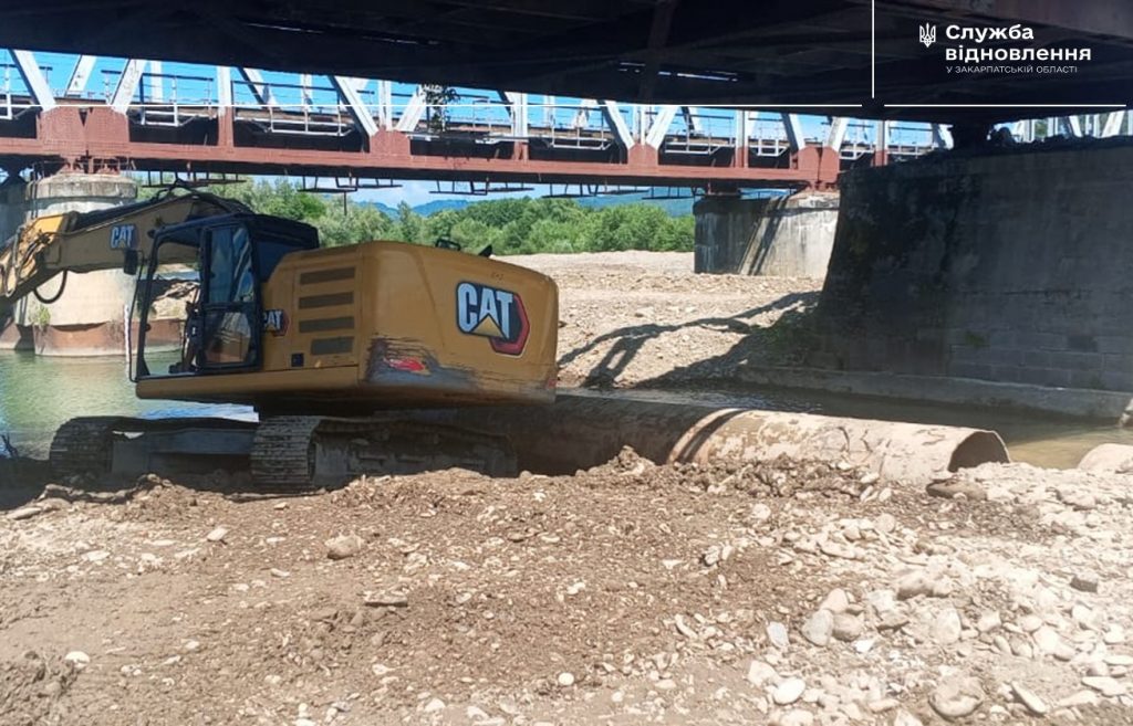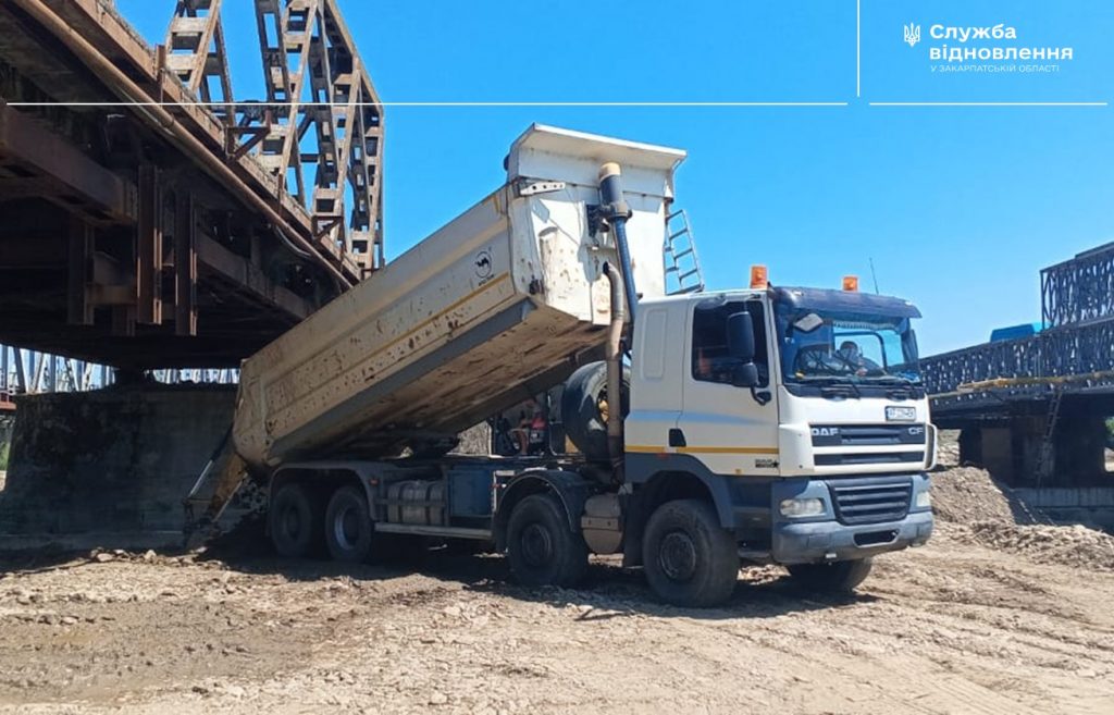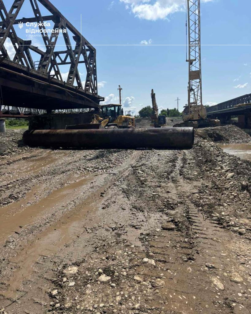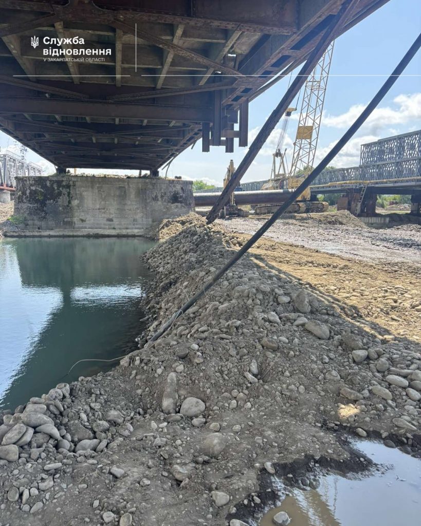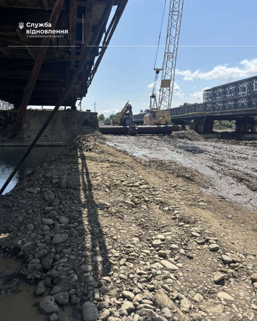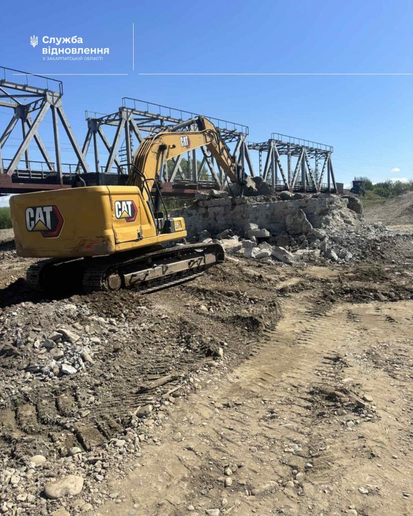 Для можливості виконання цих робіт русло річки Тересва тимчасово перенаправили. На місці старого русла облаштували насип і технічну площадку. За допомогою крану демонтується залізобетонний настил, після чого розбиратимуть металеві ферми.