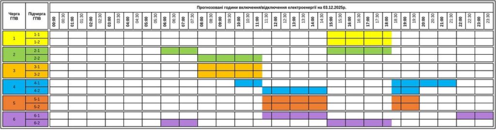 Прогнозовані години включення та відключення електроенергії на 3 грудня 2025 року: