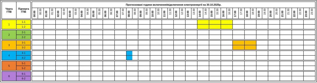 Укренерго закликає громадян стежити за оперативними повідомленнями, оскільки ситуація може змінюватись. Дізнатися графік відключень за конкретною адресою можна на офіційних сторінках місцевих обленерго. На ранок 30 жовтня прогнозовано такий розклад: