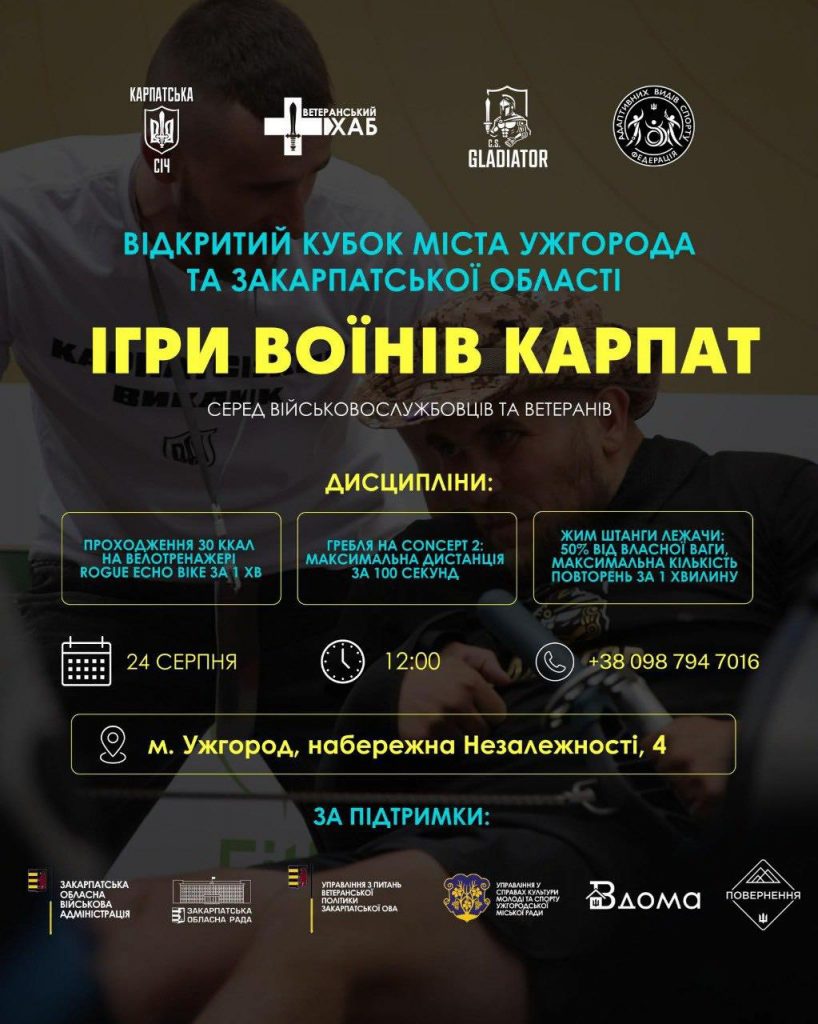 24 серпня в Ужгороді відбудеться Відкритий кубок міста та Закарпатської області з функціональних і силових видів спорту під назвою «Ігри Воїнів Карпат». У змаганнях візьмуть участь військовослужбовці, ветерани та особи з інвалідністю, зокрема ті, хто отримав поранення під час бойових дій.