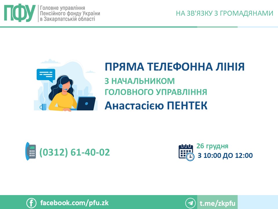У п’ятницю, 26 грудня, з 10:00 до 12:00 у Головному управлінні Пенсійного фонду України в Закарпатській області працюватиме «пряма» телефонна лінія.