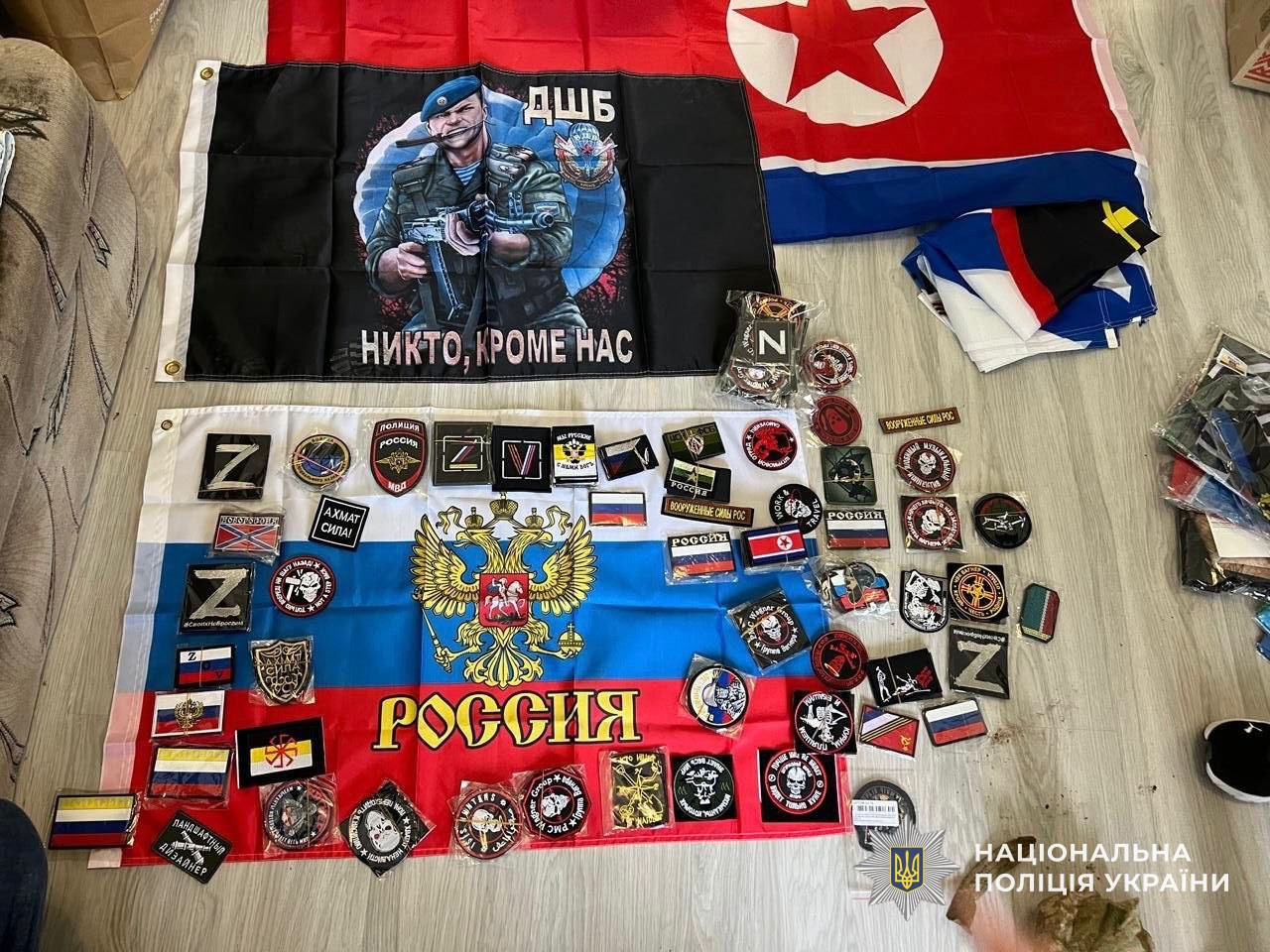 В ході обшуку поліцейські виявили предмети, схожі на археологічні знахідки, фрагменти старовинних артефактів та колекційні монети, серед яких були й монети часів Римської імперії. Крім того, у помешканні зловмисника було знайдено велику кількість предметів з російською та окупаційною символікою, включаючи 72 прапори рф, близько 150 нашивок та шевронів з символікою російської армії, а також значки й ордени фсб рф та срср. Серед вилученого також були чотири старовинні бронзові сокири-кельти та інші предмети значної культурної й історичної цінності.