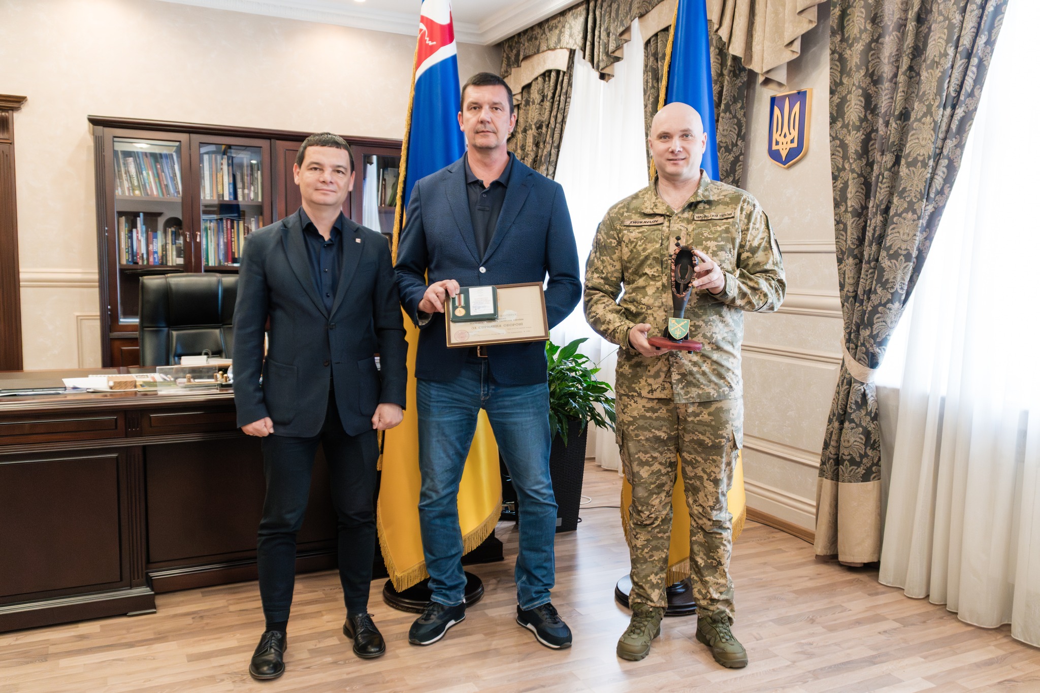 Полковник Микола Журавльов, начальник Чернігівського обласного територіального центру комплектування та соціальної підтримки, виконав почесну місію – вручив керівнику Асоціації «Термальні води України» Олексію Іванчу відзнаку Міністра оборони України «За сприяння обороні».