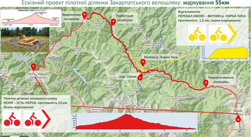 Пілотний маршрут «Усть-Чорна – Ясіня» завдовжки 55 км було створено за підтримки Закарпатської ОВА. Його шлях починається поблизу мальовничих витоків Чорної Тиси та перевалу Околе. Проєкт вирізняється сучасною інфраструктурою: для мандрівників облаштовано комфортні зони відпочинку, велопарковки, кемпінги, оглядові майданчики та затишні туристичні садиби з локальною кухнею.