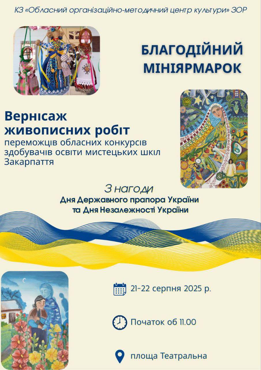 Закарпатский областной организационно-методический центр культуры приглашает жителей и гостей Ужгорода на благотворительный мини-ярмарок и вернисаж, посвящённые Дню Государственного Флага и Дню Независимости Украины.