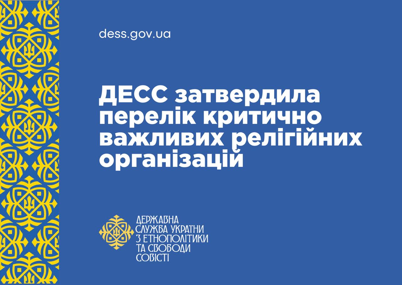 Государственная служба Украины по вопросам этнополитики и свободы совести (ДЕСС) утвердила перечень религиозных организаций, критически важных для функционирования экономики и обеспечения жизнедеятельности населения в особый период.