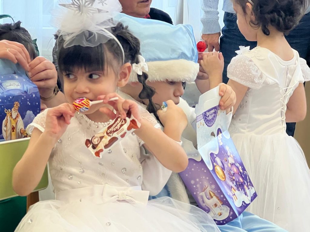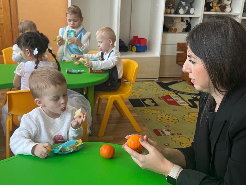 В завершение праздничного дня представительницы таможни посетили группы, пообщались с малышами и угостили их фруктами и сладостями, получив в ответ искреннюю радость.