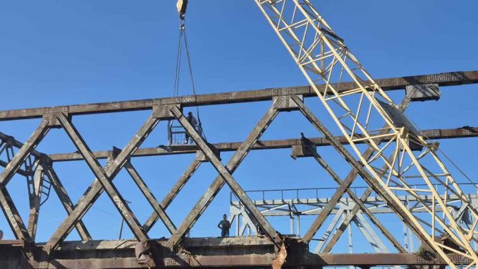 В рамках реконструкции уже полностью демонтировано железобетонное покрытие последней пролётной секции, а также частично разобраны боковые металлические фермы.