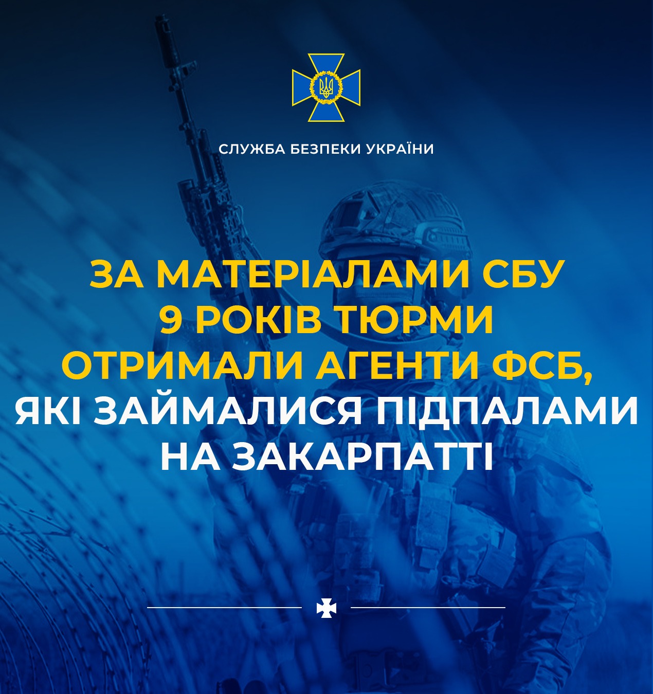 В Закарпатской области суд приговорил к 9 годам лишения свободы двух агентов ФСБ, причастных к поджогам объектов критической инфраструктуры по заданию российских спецслужб. Благодаря доказательной базе, собранной СБУ, фигуранты признаны виновными в диверсии, совершённой группой лиц по предварительному сговору в условиях военного положения.