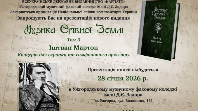 Сегодня, 28 января, в Ужгороде состоится знаковое событие для творческого сообщества края — презентация третьего тома издания «Музыка Серебряной Земли». Новая книга включает в себя Концерт для скрипки и симфонического оркестра выдающегося композитора Иштвана Мартона.