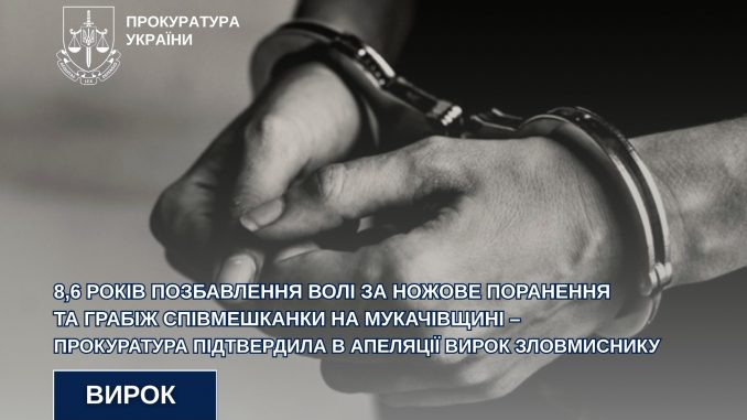 Закарпатская областная прокуратура в Апелляционном суде подтвердила законность приговора в отношении 48-летнего мужчины, осужденного за ножевое ранение и грабеж бывшей сожительницы. Ему назначено 8 лет и 6 месяцев лишения свободы.