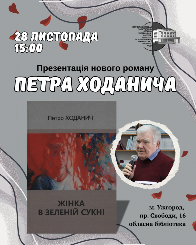 В пятницу, 28 ноября, в 15:00 в Закарпатской областной универсальной научной библиотеке им. Ф. Потушняка состоится презентация нового романа писателя Петра Ходанича «Женщина в зеленом платье».