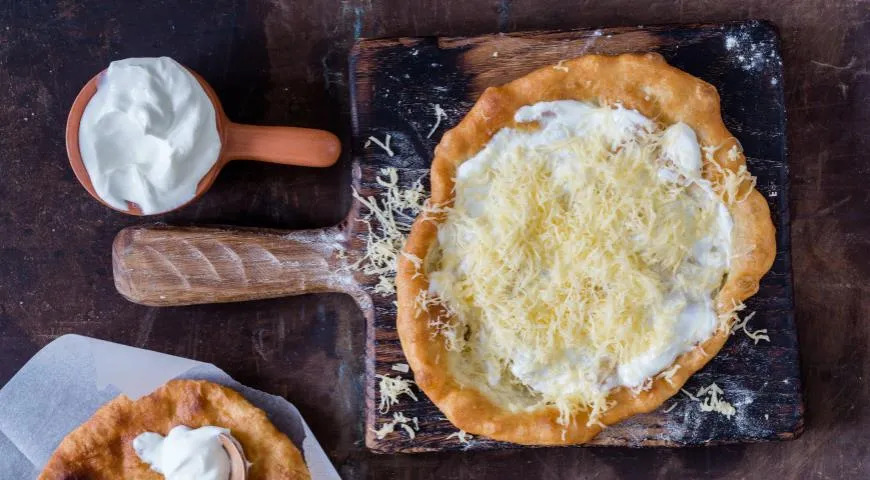 Лангоши не раскатывают скалкой – их растягивают руками. Так тесто получает характерные неровные края и правильную структуру. Важно дать тесту хорошо подойти – тогда лепешки получаются легкими и воздушными.