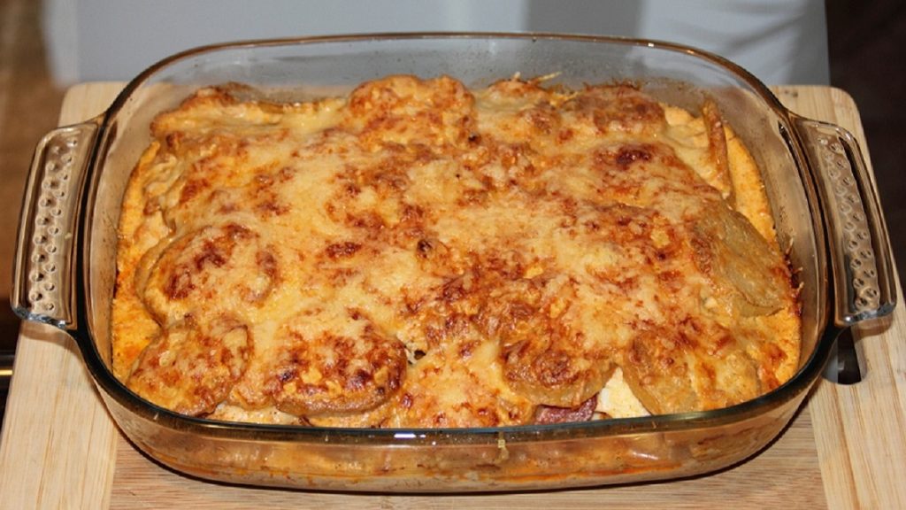 Под этим названием прячется простое, но очень вкусное блюдо – картофель, сваренный в мундирах и запеченный в сметане с яйцами, колбасой и сыром.