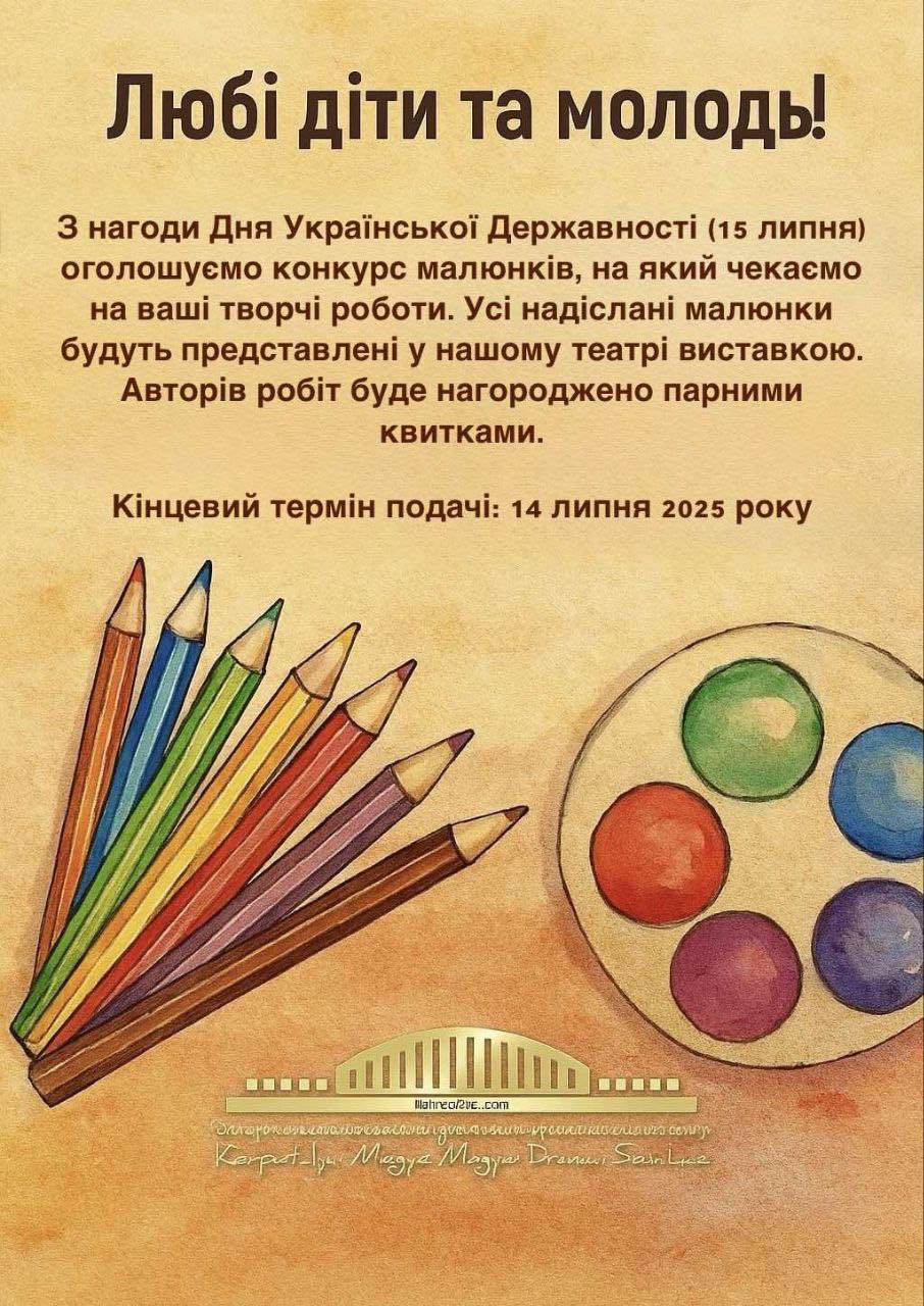 Закарпатский областной венгерский драматический театр в городе Берегово приглашает детей и молодёжь принять участие в художественном конкурсе рисунков ко Дню Государственности Украины, который отмечается 15 июля.