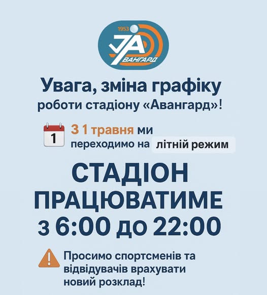 Увага! Стадіон «Авангард» змінює графік роботи у зв’язку з переходом на літній час.
