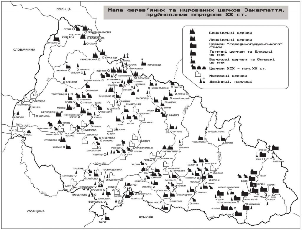 - Наприклад, на карті позначено п’ять церков лемківського стилю, зокрема церква св. арх. Михаїла в селі Грибівці (1762 р.) та класичний лемківський храм у Підгорянах (частина Мукачева).