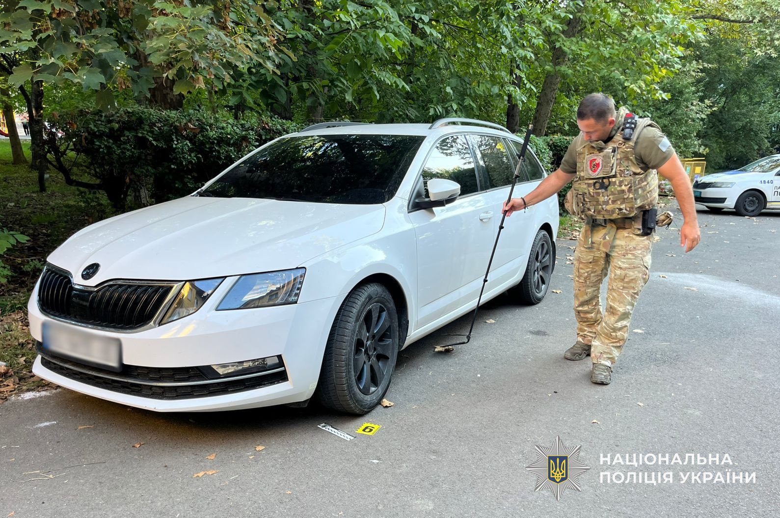 На місце події прибули слідчо-оперативна група та вибухотехніки. Під час огляду вони вилучили з-під машини предмет, який виявився тренувальною гранатою. Також на території двору знайшли рештки ще однієї імітаційної гранати. Заявниця розповіла, що напередодні ввечері чула звук, схожий на вибух петарди.