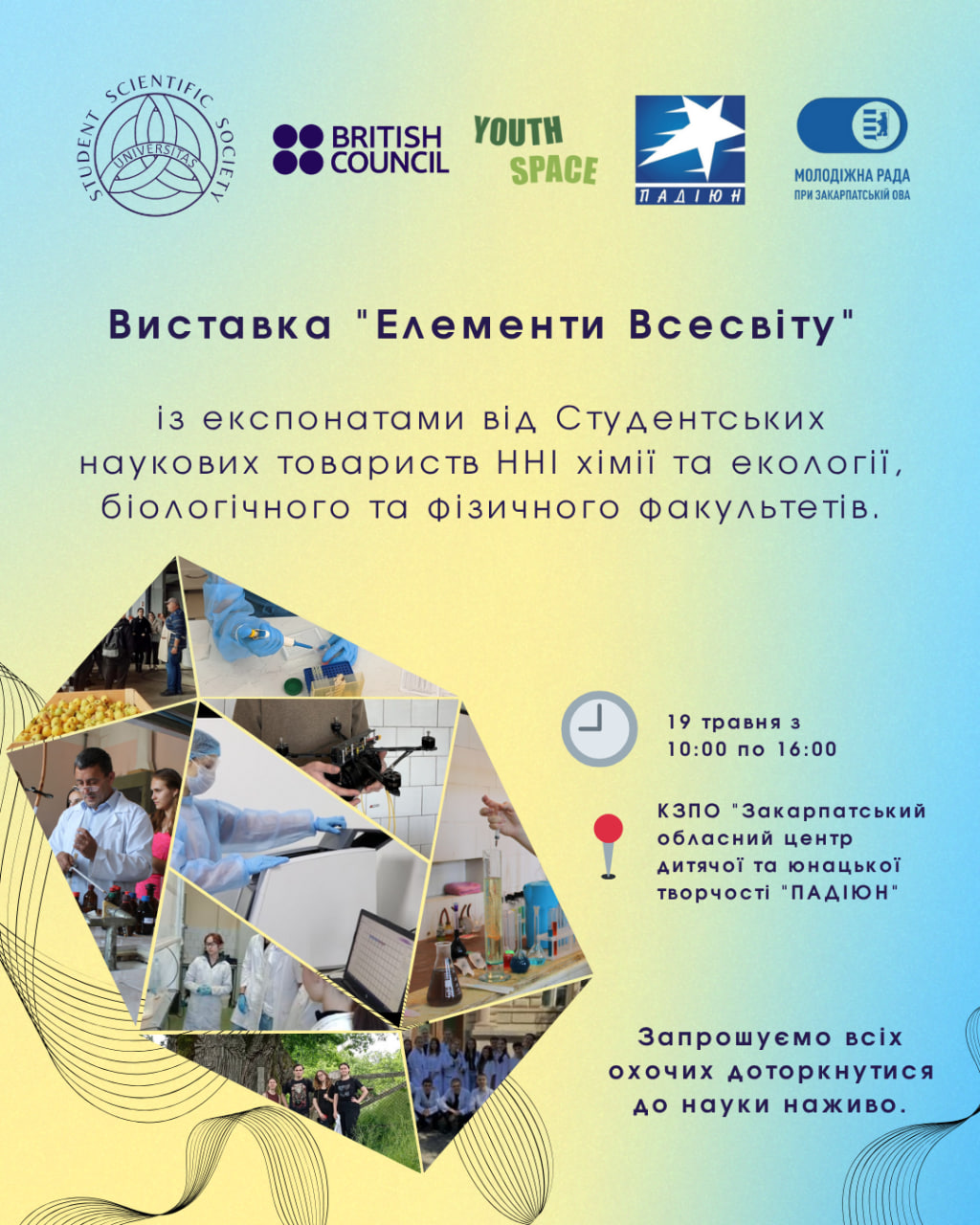 Студентське наукове товариство Ужгородського національного університету запрошує на науково-популярну виставку «Елементи Всесвіту», яка відбудеться 19 травня з 10:00 до 16:00 на базі Закарпатського обласного центру дитячої та юнацької творчості «ПАДІЮН».