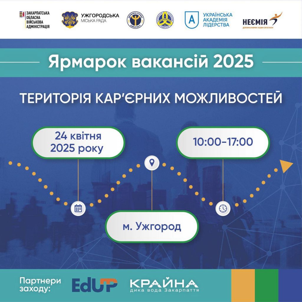 В Ужгороді 24 квітня відбудеться ярмарок вакансій, де понад 40 роботодавців представлять актуальні пропозиції роботи. Захід пройде на площі Поштовій з 10:00 до 17:00.