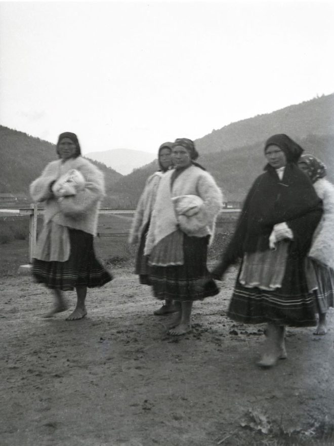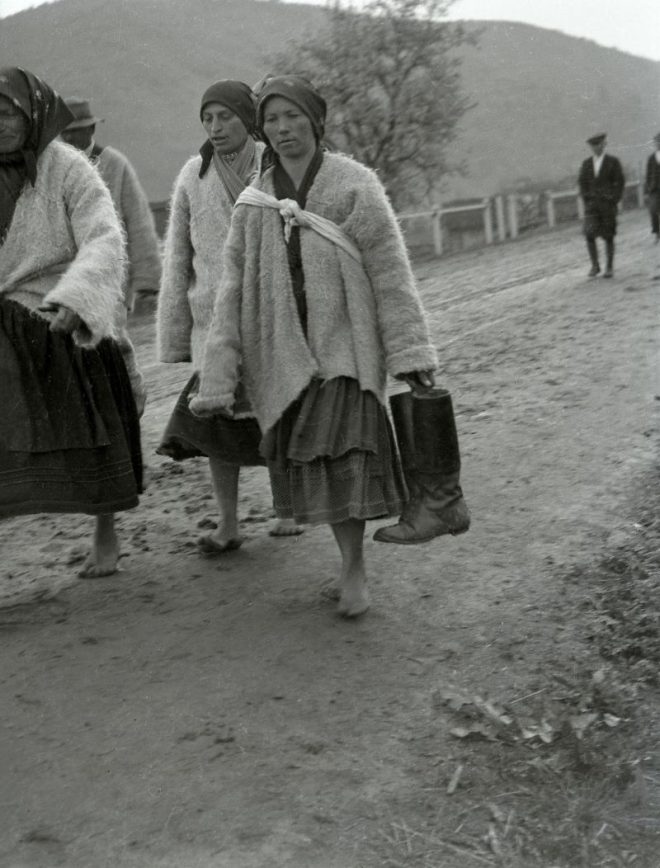 На доступних для споглядання нам світлинах — жінки й діти — у народному одязі бойківсько-лемківських етнографічних меж Закарпаття. На початку XX століття комплект такого традиційного жіночого вбрання складався з короткої сорочки, спідниці, фартуха, безрукавки, гуні, головних уборів та взуття. У літню пору жінки й діти часто ходили босоніж. На одній зі світлин фотограф зловив момент, коли одна з жінок, ступаючи по болотистій ґрунтовій дорозі, несе в руках шкіряні чоботи — недешеву рідкість того часу для селян, яку одягали на ноги здебільшого на службу до церкви.