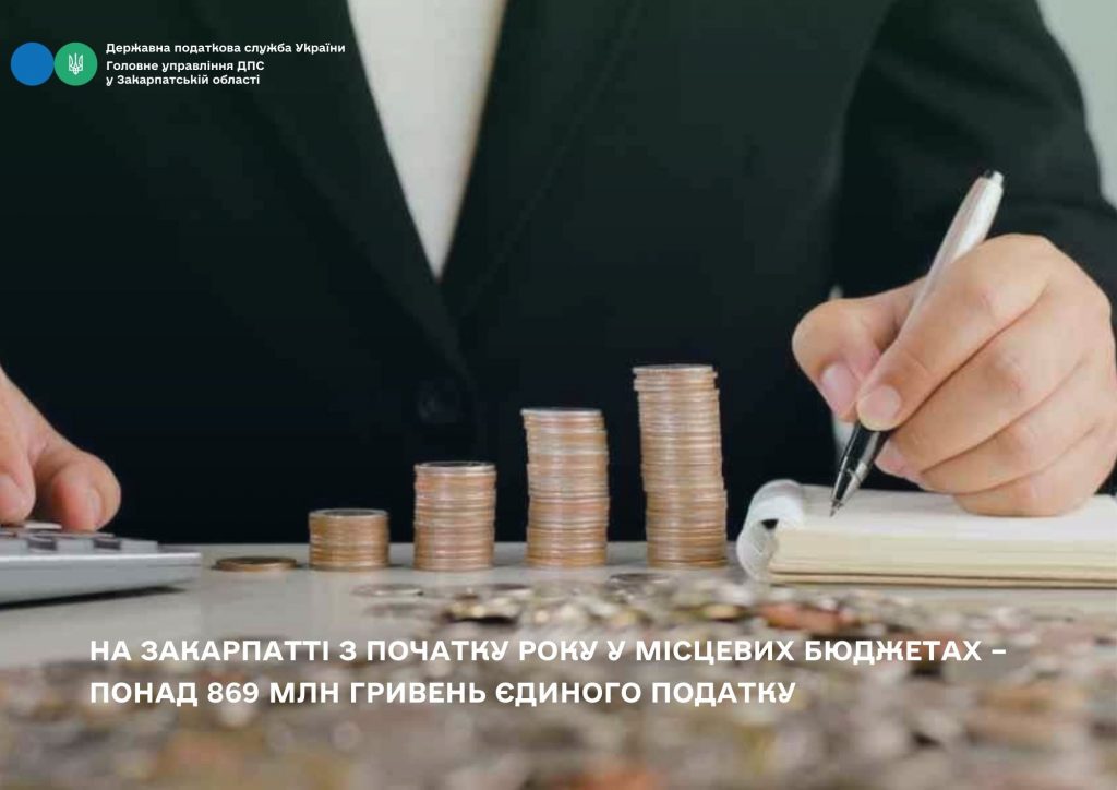 З початку 2025 року до місцевих бюджетів Закарпаття надійшло понад 896 мільйонів гривень єдиного податку. Це на 78,8 мільйона більше, ніж за аналогічний період минулого року. Про це повідомили в Головному управлінні ДПС у Закарпатській області.