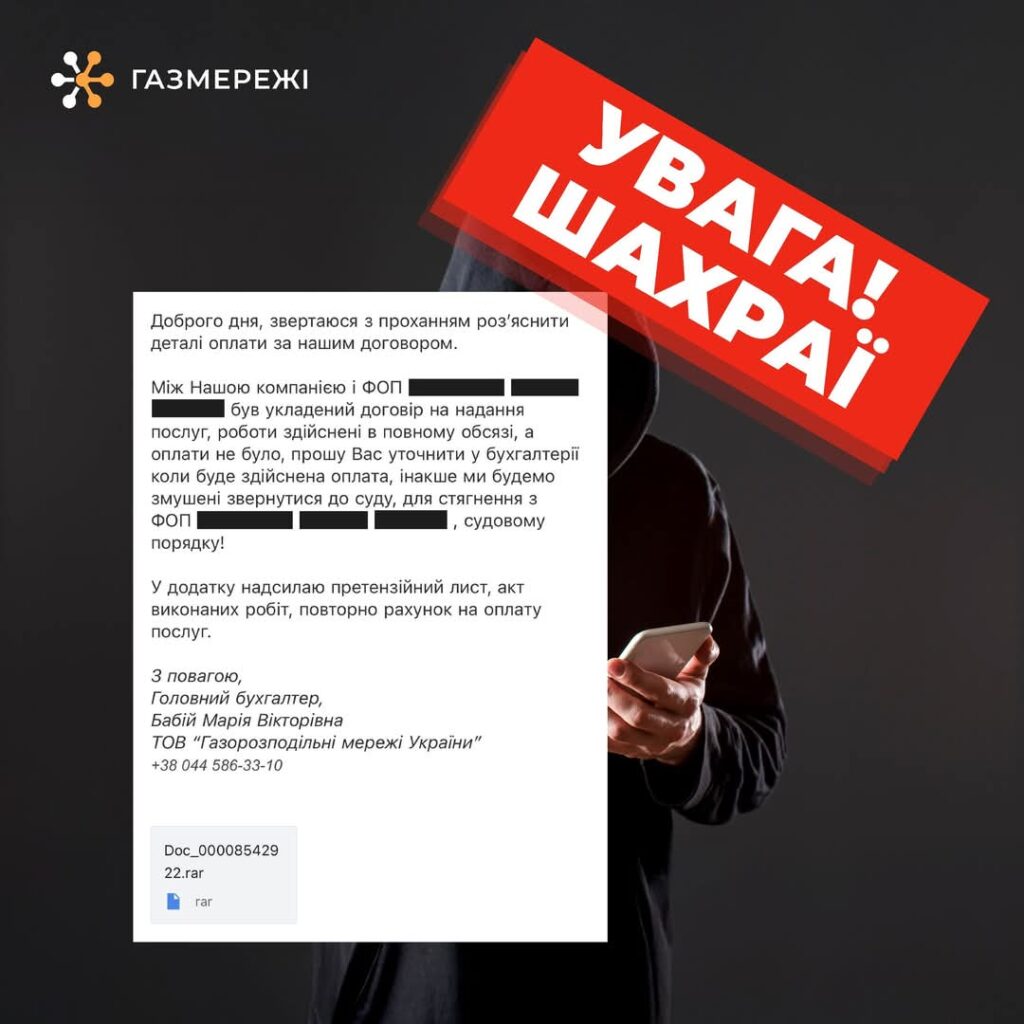 Закарпатська філія “Газмережі” попереджає про активність шахраїв, які розсилають фішингові листи від імені компанії. Зловмисники намагаються ввести абонентів в оману, пропонуючи підписати договори, оплатити рахунки або акти виконаних робіт за допомогою підозрілих посилань.